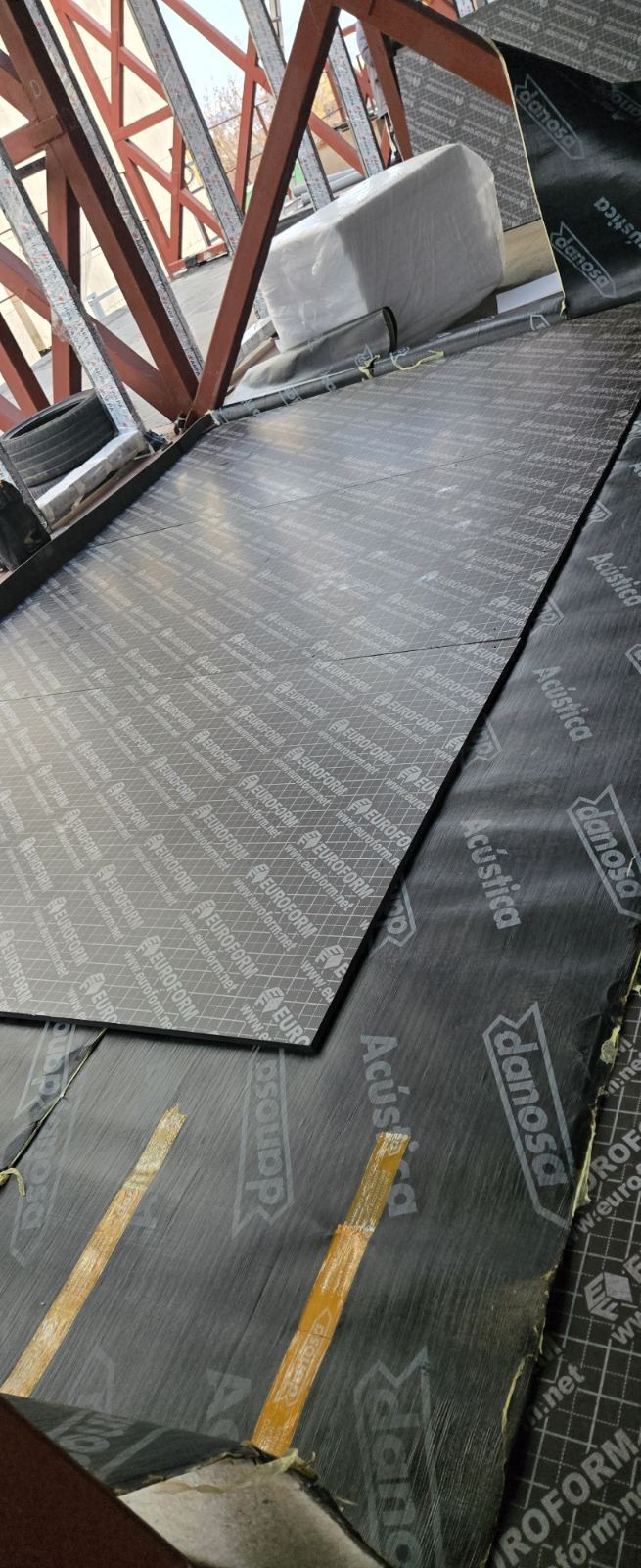 Pe podea a fost aplicat şi un strat de Acustidan 16/2 — material acustic care absorb energia sonoră și amplifică efectul de izolare fonică pe întreg spectrul de frecvențe.